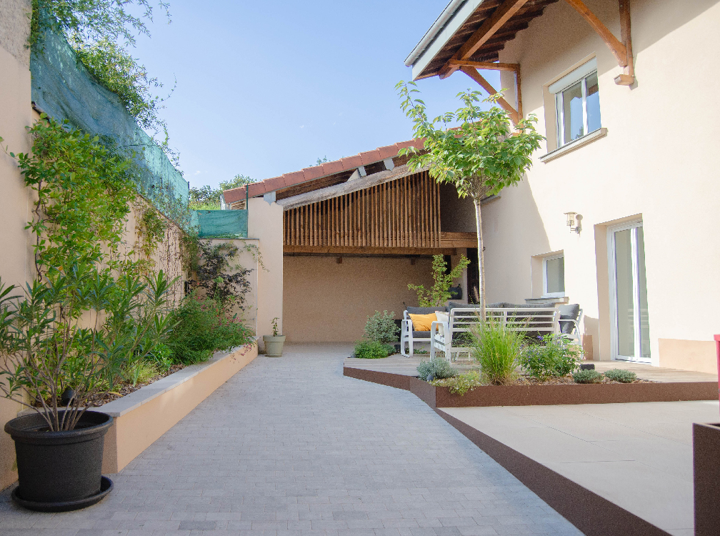 En plein coeur de Genay nous avons rénové cette petite cour urbaine dans un esprit campagne chic. Cette cour avait un potentiel énorme et l’optimisation de l’espace était un enjeux important pour les clients. Avec de multiples contraintes nous avons réussi à en faire un espace extérieur joli écrin convivial et familial.